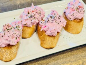 バケットに具材を乗せて食べる料理で、ブルスケッタと言います。